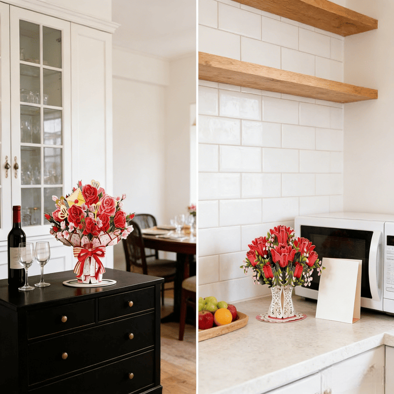 The laser-cut 3D flower bouquet is exquisitely detailed. Each 10" x 7" card opens to a romantic spectacle. The bouquet is detachable, instantly transforming into home dรฉcor, letting your love last even longer.