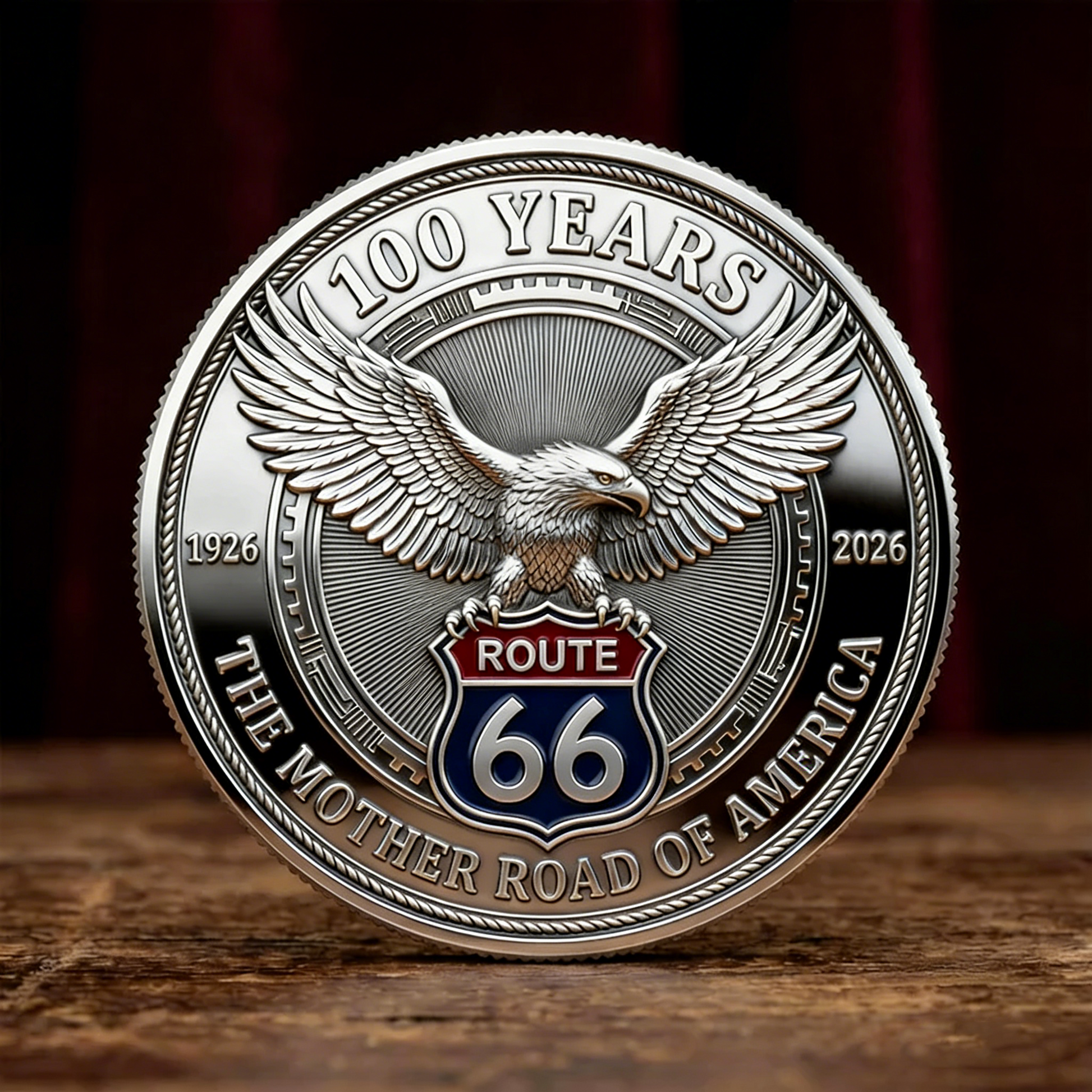 This commemorative coin honors the 100th anniversary of Route 66, the legendary highway known as The Mother Road. It’s a tribute to motion, independence, and the spirit of every traveler who ever followed that double yellow line into the horizon.